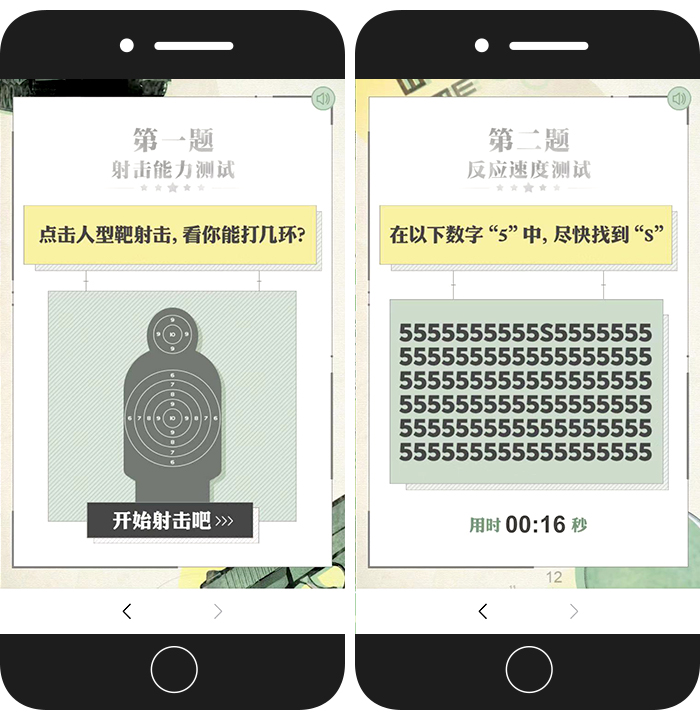 ??美學(xué)取勝吃的是設(shè)計(jì)成本,技術(shù)取勝需要強(qiáng)大的技術(shù)力量支撐,這些成功的H5背后是令人望而卻步的“燒錢流”。除了美學(xué)和技術(shù),有沒有其他方式可以打動(dòng)用戶呢?互動(dòng)取勝的H5可以做到,巧妙的因果設(shè)計(jì)和與“我”有關(guān)的互動(dòng)一樣可以吸引到用戶的關(guān)注。例如人民日?qǐng)?bào)的“測(cè)測(cè)你的軍人潛質(zhì)”。