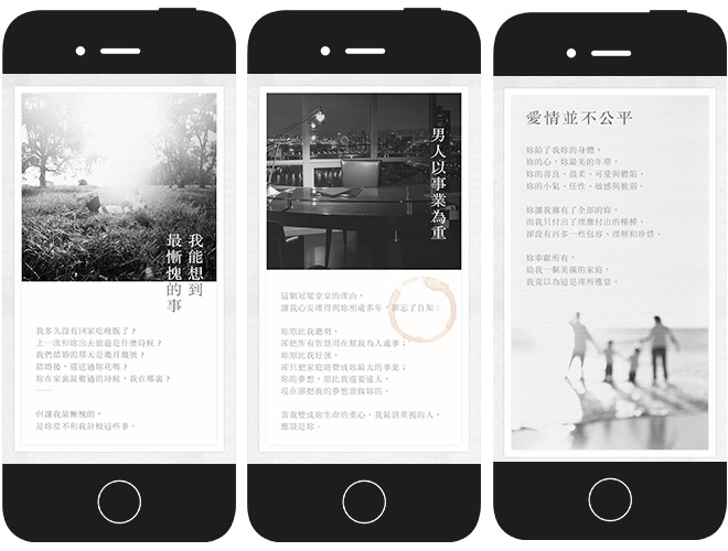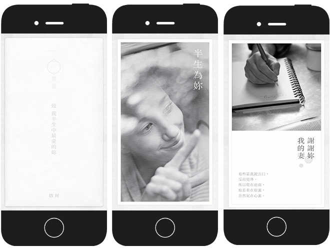 ??在互聯(lián)網(wǎng)“微時(shí)代”,這種文案占比較大的內(nèi)容可以說是鋌而走險(xiǎn)。但這個(gè)H5依然贏得了用戶的共鳴,致勝點(diǎn)是頁面的情緒氛圍渲染,大小標(biāo)題的組合突出中心思想,用戶愿意可以看完全部文案,不愿意瞄一眼大標(biāo)題也能理解H5傳達(dá)的思想。綜合以上因素,“首草先生的情書”是以美學(xué)取勝的作品,以淡雅的氛圍渲染來達(dá)到品牌的宣傳目的。