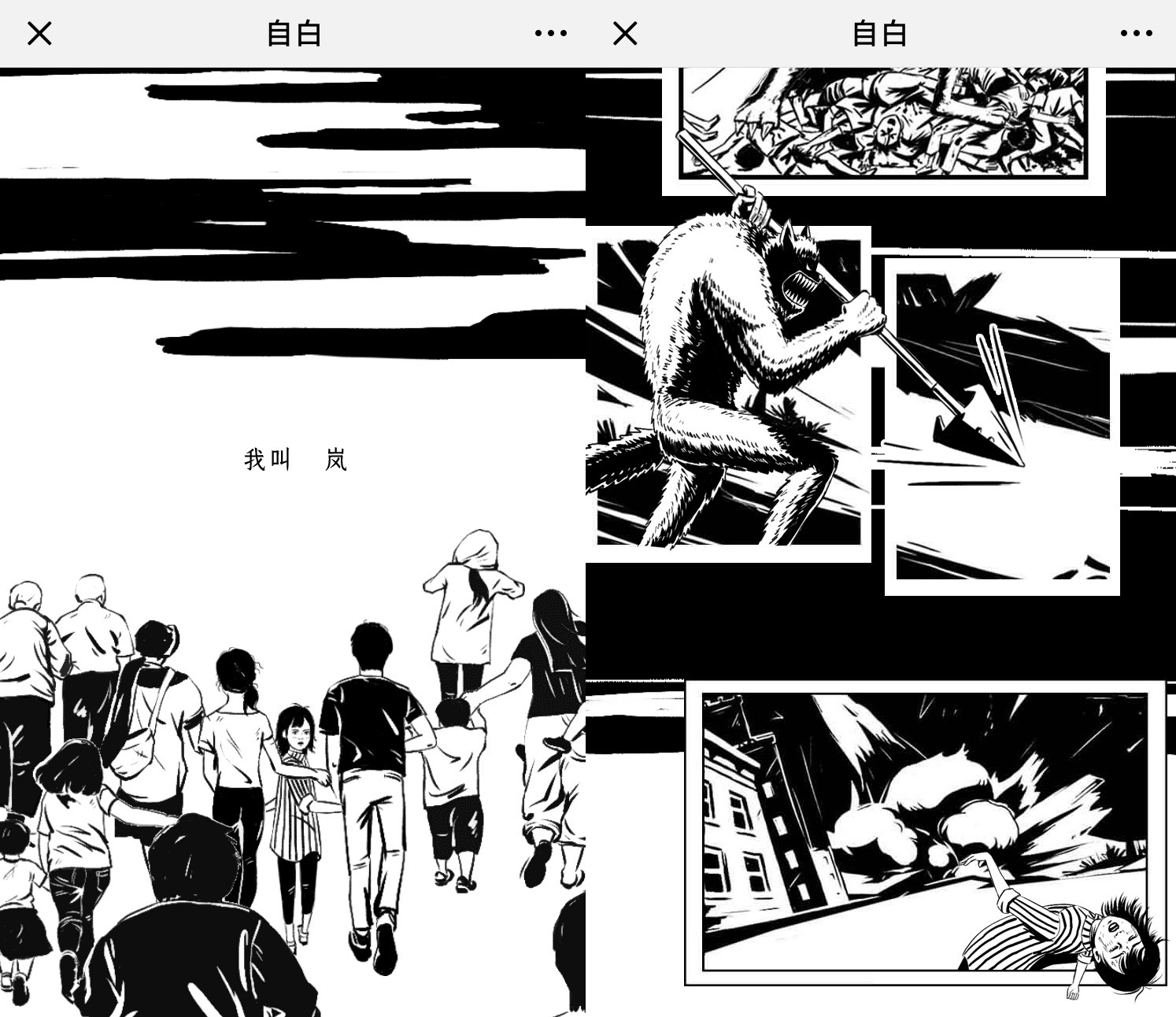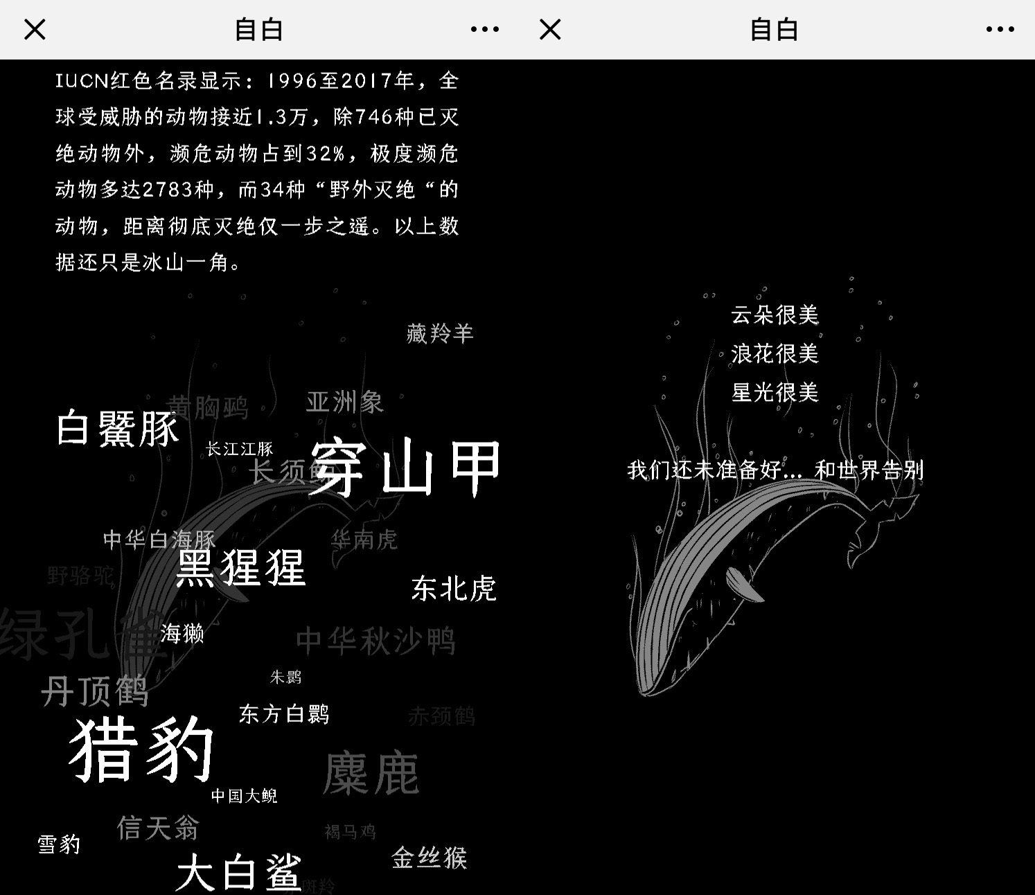 ??意外是指制造驚喜來吸注意力,或者用懸疑色彩來裝點內(nèi)容引發(fā)好奇心和興趣。比如保護瀕臨滅絕動物的H5《自白》,開頭的黑白漫畫表現(xiàn)的像是一起校園霸凌事件,主角在劇情中進行了角色變換,由女孩變?yōu)樗{鯨,隱喻人類傷害動物,就是傷害人類自己。