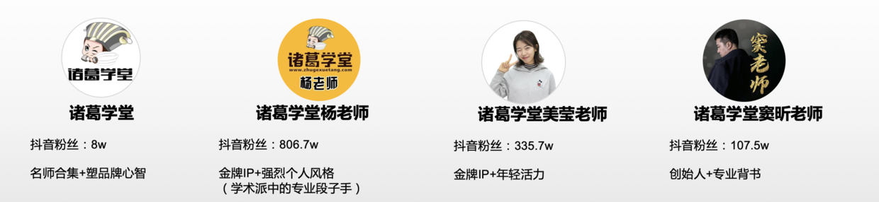 諸葛學(xué)堂官網(wǎng):名師授課拆條集錦,通過打造老師個人IP推動品牌營銷,塑造品牌占據(jù)用戶心智,是一個偏pr色彩的賬號。