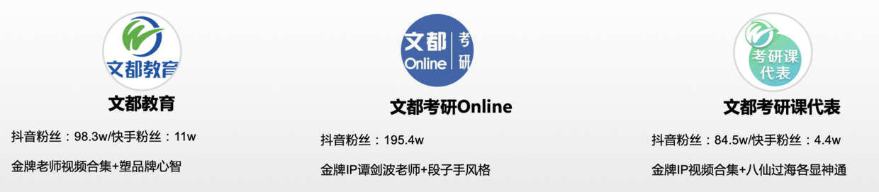 ? 文都教育是總部位于陜西的一家教育考試平臺,業(yè)務(wù)覆蓋大學(xué)教育、職業(yè)教育和校企合作等教育培訓(xùn)領(lǐng)域。主要布局抖音,單一平臺賬號矩陣總粉絲量400萬+,快手剛剛?cè)腭v,不久前在快手披露的「快手教育生態(tài)合伙人」,文都教育也是其中一員。文都教育有意思的一點是,地方學(xué)校也紛紛布局了抖音賬號且運營不錯。賬號「湖北文都教育」抖音粉絲163.4萬,「湖北文都考研」抖音粉絲88.6萬。
